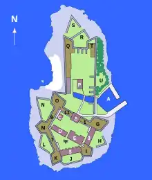 A: Harbour, B: Tower and church, C: Corps de Garde, D: Commandant's Quarters, E: Headquarters, F: Well, G: North Star Bastion, H: Prince Frederick Ravelin, I: Dolphin' Bastion, J: Beach Battery, K: Mermaid Bastion, L: Rosenlund Ravelin, M: Whale Bastion, N: Woodstore Ravelin, O: Lobster Bastion, P: Hospital, Q: West Corner, R:  Smithy Ravelin, S: Stone Glacis, T: East Corner, U: Commandant's Garden