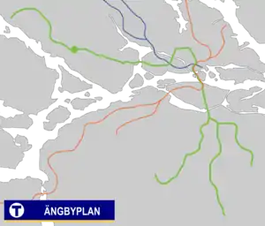Ängbyplan metro station, formerly known as Färjestadsvägen metro station, is a station on the Green line of the Stockholm metro. It is located in the district of Södra Ängby, which is part of the borough of Bromma in the west of the city of Stockholm. The station is above ground and has a single island platform, with access from the underpass taking Färjestadsvägen under the line.[2][3] The distance to Slussen is 12.4 km (7.705 miles).