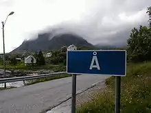 Å (Norwegian pronunciation: [oː], from å meaning "stream") is a village in Moskenes Municipality in Nordland county, Norway. It is located about two kilometres (1+1⁄4 mi) southwest of the village of Sørvågen on the island of Moskenesøya, towards the southern end of the Lofoten archipelago. It is connected to the rest of the archipelago by the European route E10 highway, which ends here. This part of the highway is also called King Olav's Road.