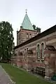The church is situated in the western neighbourhood Åby which was formerly a village. The original church constructed of ashlar was built c. 1200 and in the Late Middle Ages it was lengthened towards the west. Two imposts in the chancel arch which were transferred to the new building, the one in the south is, owing to its cylindrical shape, assumed to be an imitation in stone of a decorated wooden post.[3]