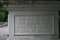 The bridge has an inscription which serves as a warning: "100 MAND KAN IEG BÆRE, MEN SVIGTER UNDER TAKTFAST MARSCH."