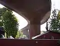 A western bridge, designed by Sir Norman Foster (1935-), 833 metres long and 19,5 metres wide, was finally inaugurated in 2005. Along with the new bridge a new commuter train station, Årstaberg, was created south of the bridges.[4] Twice the width of the old, thus permitting an elevated pathway next to the railway, the pillars of the new bridge are not only much more slender, but also reduced to ten, less than half of the old. Preceded by two decades of fiery debate, as Foster had the bridge painted in falu red, a traditional deep red colour, the bridge was nicknamed falukorven (a Swedish sausage) by its critics.[3]