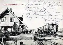 The station opened on 2 January 1879,[4] and was designed by the Norwegian architect Peter Andreas Blix in Swiss chalet style.[5] The Norwegian author Knut Hamsun wrote several letters at the station between 1897 and 1906.[6] When the section between Ski and Moss Station was upgraded to double tracks in 1992, Ås Station received a major renovation.[7][8] In 2000, a 16-year-old boy had huffed lighter gas at the station, and was found dead on the platform the next morning.[9][10] On 25 October 2006, a cultural meeting place was established inside the station building, initiated by the association "Galleri Texas".[11] The building is located in Brekkeveien 4,[12] and houses a tiny café known as "Kafé Åsheim",[13] an art gallery,[14] and a small gift shop.[15] The café serves local commuters riding to Oslo in the morning, as well as dining and lunch guests residing in the area around the station.[16][17] In the weekends, there are sometimes arranged concerts with local bands and musicians.[18][19][20][21]