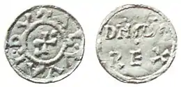 However, when Edward's army approached and camped at Badbury Rings, an Iron Age hill fort four miles west of Wimborne, Æthelwold was unable to gain sufficient support to meet them in battle. Leaving behind his consort, he fled to the Danes of Northumbria, who accepted him as king.[40] Northumbrian coins were issued at this time in the name of a king called 'Alwaldus', who is thought to have been Æthelwold.[41][lower-alpha 10] Norse sagas record traditions of a Danish king Knútr, who briefly ruled Northumbria around 900. He is said to have been at first repulsed by an English king called Adalbrigt north of Cleveland, but then to have defeated him at Scarborough. In 1987, Smyth suggested that Adalbrigt could have been Æthelwold,[43] but in 1995 Smyth put forward the alternative idea that the Northumbrian Danes accepted Æthelwold's claim to be king of the West Saxons rather than taking him as their own king.[44]