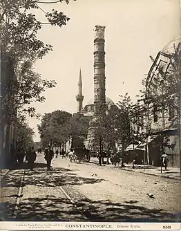 Çemberlitaş, Fatih in 1905, with the Column of Constantine (here referenced as the "Burnt Column" (Colonne Brûlée) and the Gazi Atik Ali Paşa Mosque in the background.