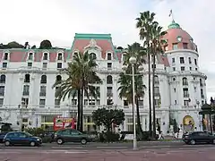 In 1912 Niermans created the Hotel Negresco on the Promenade des Anglais in Nice for the Romanian hotelier Henri Négresco. He designed it for the reception of royalty, as with other hôtels-palais on the Riviera. This was a time when the Riviera was at the height of its popularity as a resort for the wealthy or high-born, two years before the outbreak of World War I.[3] It was a rectangular building that occupied a full block of the Promenade des Anglais with four hundred rooms, each with a private bath. Two cupolas at the east and west corners were said to have been inspired by the breasts of La Belle Otero. The building had modern features like electric lights, elevators and telephones. A huge ballroom was roofed by a glass dome. Eight kings were present when the hotel opened in November 1912.[11]