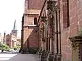 The church's exterior architecture is strikingly clear-cut, insofar as its visible parts are growing younger from East to West, or older from West to East. The purely Romanesque superposed chapels behind the choir date from the 11th century; the choir itself, the transept and the easternmost bay of the nave date from the late 12th and early 13th century and reflect a transitional style between Romanesque and Gothic architecture; the rest of the nave was rebuilt later in the 13th century, in a sober but well defined Gothic style; while the facade with its porch tower was rebuilt between 1768 and 1773 in the Louis Quinze style. The crossing tower was modified by architect Émile Boeswillwald during a restoration campaign in the years 1852–1858.[1][3] Interestingly, the former church of the nearby Marmoutier Abbey has an identical architectural history, but in reverse: the western part is Romanesque, the nave is Gothic and the choir was rebuilt in the 18th century. Each church also has a crypt that is even older than the surfacing parts (in Neuwiller's case, it dates from the 9th century).[4]