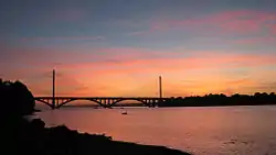 The Élorn (French pronunciation: [elɔʁn]; in Breton - Elorn, without the accent) is a 56.4 km long river in Brittany, France.[1] Its source is in the monts d'Arrée, 1.5 km NNE of Le Tuchenn Kador, and it then runs through several small towns such as Sizun and Landivisiau before flowing out into the roadstead of Brest. This river is the birthplace of the legendary Dragon of the Élorn. The maritime part of the river stops at Landerneau, where the Pont de Rohan blocks seaborne ships from sailing any further upstream. The river also crosses the château de la Roche-Maurice and many abandoned mills, and on the banks of its maritime part are several family properties belonging to families in Brest (Park an Coat, le Frout, Beau Repos, le Petit Manoir de Poul ar Velin). At low tide the mud is met, at high tide the sea flows over the countryside.