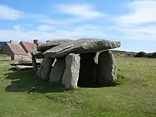 On the island is a prehistoric site, an allée couverte (gallery grave), known as Ty Liac'h, built in the Neolithic period. It is in the central part of the ridge of the island. There are ten upright stones, supporting three horizontal slabs. There are other stones on the ground which once were supporting stones; there was at least one other horizontal slab. The original length was 14–19 metres (46–62 ft), and it had a lateral entrance on the north side.[2]