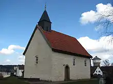 - The Protestant Chapel, which is the landmark of the village, was probably built around 800.[3] Originally, it was dedicated to Saint Mary-Magdalena. The chapel is on a small hill which might be of an artificial origin. The year 1511 possible referring to a renovation is indicated above the entrance. The chapel has firing slits and might have been used as a fortified church during times of war in the Middle Ages. After the Reformation the chapel was allocated to the Protestants. When the chapel was renovated in 2005, frescoes dating from the 12th and 13th centuries were discovered. The altar in the apse dates from the end of the 17th century and its painting is from 1677.[4] The chapel has a wooden ceiling and a gable roof with a flèche and its small apse has a tented roof. The medieval frescoes which were discovered in 2005 are not visible, as they were covered with white paint due to the lack of financial means for an appropriate restoration.