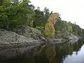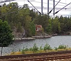 The tall buildings of Handen commercial centre along the eastern shore of the lake contrast the dense forest of the Rudan Open-air Area on the opposite shore. The proximity to the commuter rail station at Handen, makes the lake easily accessible to a large number of people, while the forests surrounding it makes it attractive to open-air lovers. It is used for bathing in summers and cross-country skiing in winters.[4]