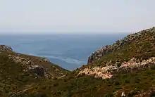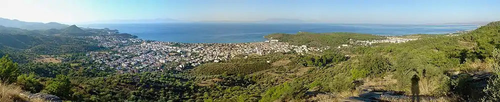 The town reaches approximately 100 m (330 ft) at its highest elevation,[20] with mountainous terrain surrounding it to the north within the peninsula. This is a result of Turkey's fault block features – the convergence of the Anatolian plate against that of the Aegean Sea Plate – and the wide range of mountains in western Turkey and the Aegean Region surrounding the Büyük Menderes River to the south, collectively referred to as the Menderes Massif.[21]
