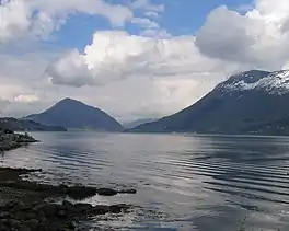 Ørstafjorden is a fjord in the municipality of Ørsta, Møre og Romsdal, Norway. The 10-kilometre (6.2 mi) long fjord runs from the village of Ørsta to the Vartdalsfjorden. The fjord is about 2 kilometres (1.2 mi) wide and the deepest point in the fjord reaches 172 metres (564 ft) below sea level. The European route E39 highway runs along the eastern and southern shores of the fjord. The southern entrance to the Eiksund Tunnel is located along the western shore of the fjord.[1] The inner parts of the fjord do freeze when there are extended periods of cold weather in the winters.