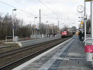 Übach-Palenberg station is in Übach-Palenberg on the southern edge of Heinsberg in the German state of North Rhine-Westphalia. It is located on the Aachen–Mönchengladbach railway on the western outskirts of Palenberg near the Wurm and is served by the Wupper-Express and the Rhein-Niers-Bahn. Its current form reflects its reconstruction and modernisation in the 1990s and in 2008. It is classified by Deutsche Bahn as a category 5 station.[1]