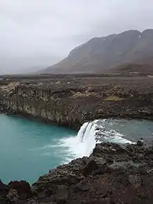 Þjófafoss (Icelandic pronunciation: [ˈθjouː(v)aˌfɔsː], "thieves' waterfall"; also Thjofafoss) is located on the river Þjórsá on the east side of the Merkurhraun lava fields in the south of Iceland, at the southwest tip of the hill Búrfell. A viewing point for the waterfall can be accessed by a gravel track that leads about 4 kilometres (2.5 mi) northwest from Route 26 or by a track that leads south from Route 32 past the hydroelectric power station Búrfellsstöð and Hjálparfoss.