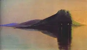 The memoirs of polar explorer and artist Nikolay Pinegin who saw the area when he was taking part in a 1913 polar expedition of Georgy Sedov say: "On the foggy days when we saw these headlands, they resembled the visions of the fantasy painter Čiurlionis". Latter writers attributed the naming to Pinegin.[2] A member of another expedition to the area, Vyacheslav Alekseyevich Markin, published a photo in his book, from which it can be concluded that the inspiration was the painting Stillness by Čiurlionis.[3][4][5] Vyacheslav Markin suggests the name of the bay, "Tikhaya" ("Still, "Quiet") was inspired by the name of the painting.[2]