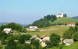 The parish church in the settlement is dedicated to Saint Leonard.[7] It stands west of the settlement on Church Hill (Cerkovni grič). A church at the site was first mentioned in 1526, reworked in 1758. The current structure was built in 1899 based on plans by Moritz (or Moric) Kirchschlager[8] after the earthquake of 1895, which destroyed the previous structure. The interior was painted by Simon Ogrin.[8] The main altar was made in the Ljubljana workshop of the Toman (Thomann) family of stonemasons, and the side altar and pulpit are the work of Valentin Šubic (1859–1927). A chapel dedicated to the Virgin Mary was built next to the rectory in 1850.[4] The church is registered as a cultural monument.[8]
