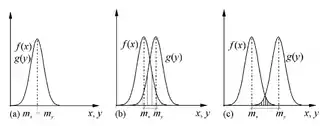 Calculating the arithmetic mean for all pairs |xi − yj| we should then obtain the value of L–K metric DNN(X, Y). Its characteristic curvilinearity arises from the symmetry of modulus and overlapping of distributions f(x), g(y) when their means approach each other.
