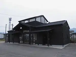 The station, which is unstaffed, consists of an island platform serving two tracks at grade. The station building, built in 2006, is a timber structure in traditional Japanese style with a skylight. It serves as a waiting room as well as a local community facility. Access to the island platform is by means of a level crossing.[2][3][4][5]