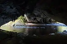 Moria Gate Arch is 19 m high and 43 m wide[1] and its ceiling is extensively covered with stalactites and roots. The center portion of the river cave is spacious and its floor covered in sand accumulated by the Oparara River flowing through it, making it easy to explore the cave along the river's edge to both entrances.