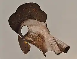 The grave goods included a set of small bronze mirrors, with diameters of 26, 31 and 34 mm, 21 translucent green glass magatama, and other jewelry, iron agricultural implements, an iron sword and helmet. However, the most valuable object was a set of horse armor, including a horse helmet, consisting of cheek pads, a semi-cylindrical shaffron and several iron plates. It is the only complete example which has been excavated in Japan, although a partial example was found at the Shogunyama Kofun in Saitama Prefecture and more than ten examples have been found on the Korean Peninsula. Identical armor is showing a mural in the Tomb of the General, a Goguryeo royal tomb located in what is now Ji'an, Jilin province, China. All of the grave goods indicate a pronounced relationship with continental culture. The excavated relics are on display at the Wakayama City Museum. [3]