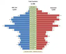 The Ōtsuki Town Hall displays its demographics on its homepage. These statistics are updated bi-monthly. The population of Ōtsuki peaked at 13,688 in 1960, and has seen a steady yearly decline since.[5] Ōtsuki has issues with rural flight and population decline, much like other parts of rural Japan.[6][7] As can be seen in the graph provided, the majority of residents in Ōtsuki were between 45 and 84 years of age in 2006.