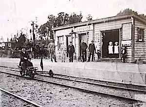 By 20 March 1908 there was a passing loop for 48 wagons. In 1980 it was extended to an 82 wagon capacity.[4] In 1910 a large timber mill and siding were built.[7] Traffic in 1911 averaged 6 wagon loads a day.[8] from 5 nearby sawmills,[9] which cut matai, rimu and kahikatea.[10]