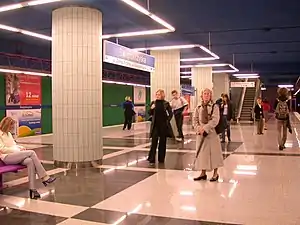 Metro Świętokrzyska (Polish pronunciation: [ɕfjɛntɔˈkʂɨska]) is a transfer station on Lines M1 and M2 of the Warsaw Metro, located under the crossing of Świętokrzyska and Marszałkowska streets in the borough of Śródmieście. The station on M1 was opened on 11 May 2001 as part of the extension of M1 north from Centrum to Ratusz. Świętokrzyska is used as a change-over between Lines M1 and M2,[1] and is the only transfer between M1 and M2 metro lines. The station on the second metro line fully opened for passenger use on 8 March 2015 as part of the inaugural stretch of Line M2 between Rondo Daszyńskiego and Dworzec Wileński.[1][2] It was designed by Polish architect Andrzej M. Chołdzyński and constructed by Metroprojekt.[3] Murals were created by Wojciech Fangor, artist of the Polish School of Posters.