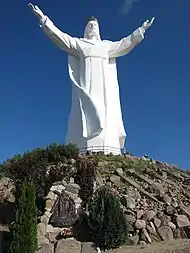 In the summer of 2008, assembly of the Christ the King, a giant statue of a crowned Jesus Christ, began on a hill on the outskirts of the town. Intended to serve as a future site of pilgrimage, the statue was completed in November 2010, and is claimed to be the world's largest statue of Jesus,[6] although if the crown is excluded the Cristo de la Concordia in Bolivia is still taller. Construction was funded by donations from local people and as far away as Canada.[6] The existence of the statue has seen fellow Poles referring to the town jokingly as Rio de Świebodzineiro.[7]