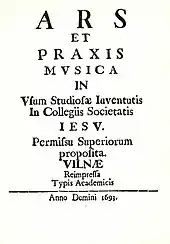 He also has written first textbook of music in Lithuania - The Art and Practice of Music (Ars et praxis musica, 1667, 1693, 1977 in Lithuanian). Common fundamentals of music explained - names of the music notes, a scale, clefs; exercises and church music examples included, plainsong (cantus planus), many-voiced, Gregorian, hard (cantus durus) and soft (cantus mollis) chant modes examined.[1]