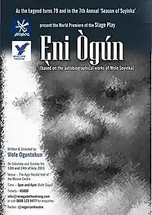Ẹni Ògún is a biographical stage play performed in celebration of Wole Soyinka's 80th birthday.[1] The play, which lasted for two days, was performed at Muson Centre and was written and directed by Wole Oguntokun.[2]