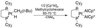 [Cp*Al] is also able to act as a potent ligand to transition metals. For example, treatment of [Cp*Al] with [(dcpe)Pt(H)(CH2t-Bu)] (dcpe = bis(dicyclohexylphosphino)ethane) yields [(dcpe)Pt(Cp*Al)2].[17] Other transition metals which use [Cp*Al] as a ligand include, but are not limited to d10 metal centre complexes such as [Pd(Cp*Al)4] and [Ni(Cp*Al)4],[18] and lanthanide/actinide metal centre complexes such as (CpSiMe3)3U-AlCp*, (CpSiMe3)3Nd-AlCp* and (CpSiMe3)3Ce-AlCp*.[3][19]