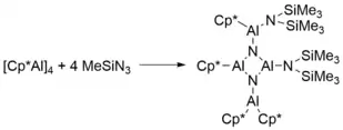 [Cp*Al]4 was also the used as a precursor to synthesize the first ever stable dimeric iminoalane containing an Al2N2 heterocycle through the treatment of [Cp*Al]4 with Me3SiN3 in a 1:4 molar ratio.[13] The resultant iminoalanes was characterized to contain an ideally planar Al2N2 core ring with three coordinate aluminium and nitrogen atoms. Other dimeric iminoalanes including [Cp*AlNSi(i-Pr)3]2, [Cp*AlNSiPh3]2 and [Cp*AlNSi(t-Bu)3]2 have since been synthesized using [Cp*Al]4 as a precursor through oxidative addition of an organic azide.[3]