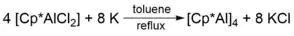 The earliest documented synthesis and characterization of Cp*Al was by Dohmeier et al. in 1991,[1] where four equivalents of AlCl in toluene/diethyl ether is reacted with two equivalents of 2[Mg(Cp*)2] to give [Cp*Al]4 as yellow crystals: