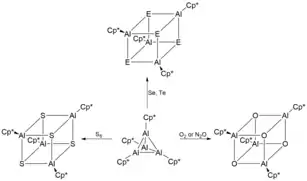 At temperatures above 100 °C, [Cp*Al]4 decomposes to form pentamethylcyclopentandiene (Cp*H), metallic aluminium (Al(0)) and other non-volatile Al(III) compounds.[2] The overall stability of [Cp*Al]4 is unique as there is a thermodynamic affinity for tetrameric aluminium(I) compounds ([RAl]4) to disproportionate into elemental aluminium and R3Al. As such, a number of different novel oligomeric structures can be synthesised when using tetrameric [Cp*Al]4 as a precursor.[6] For example, treatment of [Cp*Al]4 with excess selenium and tellurium in mild conditions gives the unique heterocubane structures [Cp*AlSe]4 and [Cp*AlTe]4 respectively.[4] These heterocubane structures are extremely air and moisture sensitive, leading to its decomposition and evolution of H2Se and H2Te respectively. Analogously, reaction of [Cp*Al]4 with lighter chalcogens such as O2, N2O and sulfur yield [Cp*AlX]4 (X = O, S).[12]