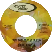 Actress Barbara Parkins, who starred in the motion picture, suggested that Warwick be considered to sing the film's theme song. The song was to be given to Judy Garland, who had been fired from the film. Warwick performed the song, and when the film became a success in the early weeks of 1968, her single of the film theme became a million-seller, peaking at #2 for four weeks on the U.S. Billboard Hot 100 (kept out of the first position by "Love is Blue" by Paul Mauriat and "(Sittin' On) The Dock of the Bay" by Otis Redding) and #1 on 4 March 1968 on WLS.[1] It also reached #2 on the Easy Listening charts in early 1968,[2][3] #2 on the Cash Box Top 100 and #1 on the Record World chart. The song was the B-side of another million selling tune composed for Warwick by Burt Bacharach and Hal David, "I Say a Little Prayer," which had hit #4 on Hot 100 on 9 December 1967.[2] The single would become one of the biggest double-sided hits of the rock era.