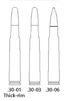 Initially the .30-01 cartridge was developed in 1901; also referred to as the .30 ball Model of 1901 or "thick-rim",[3] the .30-01 used a bullet covered by an alloy made from copper and nickel and was the immediate predecessor of the .30-03. It was short-lived however, quickly being replaced by the .30-03 cartridge.