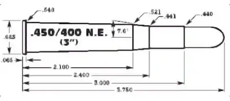 The .450/400 3¼-inch NE conversion was not initially entirely successful, under the increased pressures of the cordite loading the long neck could stick in the chamber causing the rim to pull off at extraction,[2] a problem not encountered under the milder black powder loadings. To counter this, the rim was increased in thickness to .042-inches. W.J. Jeffery & Co further improved the cartridge by reducing the length of the case to 3-inches and moving the neck further forward, creating the .450/400 3-inch NE.