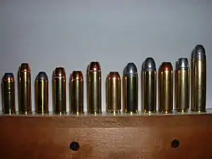 ![]() Left to Right (line by line) .44 Magnum, .445 Super Magnum, .45 Colt, .454 Casull, .480 Ruger, .475 Maximum, .50 Action Express, .500 Linebaugh, .500 Maximum, .500 S&W Magnum, .50 Beowulf, .50 Alaskan | ||||||||||||||||||||||||
