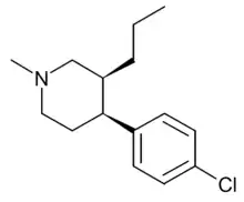 1-Methyl-3-propyl-4-(p-chlorophenyl)piperidine is a drug developed by a team led by Alan Kozikowski, which acts as a potent dopamine reuptake inhibitor, and was developed as a potential therapeutic agent for the treatment of cocaine addiction.[1] As with related compounds such as nocaine, it is a structurally simplified derivative of related phenyltropane compounds.[2] Its activity at the serotonin and noradrenaline transporters has not been published, though most related 4-phenylpiperidine derivatives are relatively selective for inhibiting dopamine reuptake over the other monoamine neurotransmitters. While several of its isomers are active, the (3S,4S)-enantiomer is by far the most potent.[3][4] The rearranged structural isomer 2-[1-(4-chlorophenyl)butyl]piperidine is also a potent inhibitor of dopamine reuptake.[5]