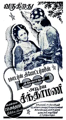 1000 Thalaivangi Apoorva Chinthamani (read as "Aayiram Thalaivangi Apoorva Chinthamani"; transl. Unique Chinthamani, who took a thousand lives) is a 1947 Indian Tamil-language fantasy adventure film directed and produced by T. R. Sundaram. The screenplay was written by Sundaram and the dialogue by Bharathidasan. Music was composed by G. Ramanathan. The film stars P. S. Govindan and V. N. Janaki.[1] The film was a big success among the masses.[2] The film was remade in Telugu as Sahasra Sirchedha Apporva Chinthamani (1960) by the same studio.[3][4]