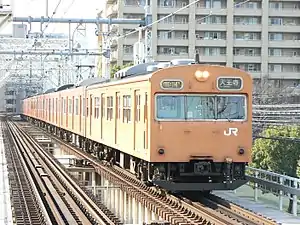 The 103 series (103系, 103-kei) is a DC electric multiple unit (EMU) commuter train type introduced in 1963[2] by Japanese National Railways (JNR), and currently operated by West Japan Railway Company (JR West) and Kyushu Railway Company (JR Kyushu). They were also operated by East Japan Railway Company (JR East) and Central Japan Railway Company (JR Central).