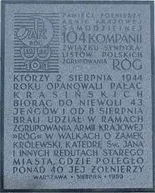 A memorial tablet in Warsaw, located near the Krasiński Palace, which was captured by soldiers of the 104 Company of Syndicalists on August 2, 1944.