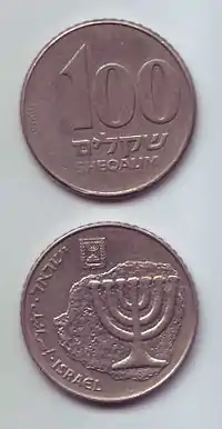 The design, by Nathan Karp, first appeared on the 100 shekel coin issued by the Bank of Israel on 2 May 1984.[7] When the old shekel currency was replaced by the new shekel in September 1985, the design was copied to the new 10 agorot coin, which was equal in value to the old 100 shekel. This design was also adopted as the symbol of the Bank of Israel.