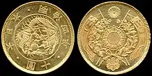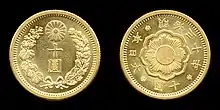 Ten yen coins were first issued in 1871 from a newly established mint at Osaka.[2] The origin of mintage is not clear as there are conflicting reports stating that ten yen coins were either minted in San Francisco, or in Japan the prior year.[3][4] In either case the unit of yen was officially adopted by the Meiji government in an act signed on June 27, 1871.[5] Under the new law each ten yen coin was to weigh 257.2 grains, and contain 90% gold with a foreign exchange rate close to a United States Eagle ($10 USD coin).[6] Gold bullion for coinage was delivered from private Japanese citizens, foreigners, and the Japanese government.[7] No ten yen coins were minted between 1871 and 1876, during this time the Japanese government tried unsuccessfully to implement a gold standard with the amount of gold in circulation described as "very trifling". Gold bullion rose to a slight premium in 1874 which caused gold coin production as a whole to rapidly fall off. It was reported in the Quarterly Journal of Economics that by 1876 more gold coins were exported to foreign countries than for use domestically.[8] Japan was later forced off of the gold standard in 1877 due to the cost of the Satsuma Rebellion.[9] Twenty years would pass before the Japanese government went back on the gold standard. During this lapse non circulating ten yen gold coins were made in two non-consecutive years for two different reasons. The first occasion occurred in 1880 when ten yen gold proof coins were struck for exclusive use in presentation sets that were given away as gifts to foreign diplomats.[10][11] The second and final instance involved the World's Columbian Exposition in 1892 where several newly minted coins were put on display.[12]