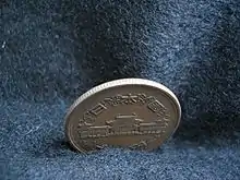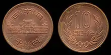The first ten yen coins made after World War II were authorized by law on March 2, 1950 by prime minister Shigeru Yoshida. These coins were to be made of German Silver, and act as "temporary subsidiary coins".[23] A total of 432,970,000 ten yen coins minted in this new alloy were recorded as struck by the end of that year. By the end of 1951 almost 800 million of these coins had been minted and were waiting to be distributed.[24][25] None of the German silver coins minted between 1950 and 1951 ever circulated as the coins were eventually melted. The decision to melt the coins came as the Korean War had driven nickel prices to about 4.1 million yen per ton.[26][27] Those that escaped being melted and are now considered by collectors to be "scarce" Japanese pattern coins.[28][29] Bronze ten yen coins were first minted in 1951, but were not released for general circulation until January 4 , 1953.[30] Ten yen coins minted between 1950 and 1958 have reeded edges and are nicknamed Giza 10 (Giza Ju, ギザ10), meaning “jagged 10 yen coin” in Japanese.[31] The design which is used today features Phoenix Hall of Byōdō-in on the obverse, and Bay laurel leaves on the reverse. The design remains essentially the same other than the reeds being dropped in 1959 which gave the coins a smooth edge. Slight modifications were also made in the latter half of 1986 regarding the design of Byōdō-in.[31] These coins are not culturally recommended as shrine offerings as another word for "10" is "toh" (十), and another word for "yen" is "en" (円). Combining these characters into "toh-en" can also read as "far destiny" (遠縁).[32] Ten yen coins continue to be produced up to the present under the Reiwa era.