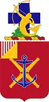The red of the shield signifies Artillery; the blue anchor is taken from the coat of arms of the old Coast Defenses of Narragansett Bay; the four cannons form the Roman numeral ten. Battery D, 10th Coast Artillery claims parentage from Battery C, 2nd Coast Artillery (formerly 14th Company, Coast Artillery Corps and Battery C, 2nd Artillery).[6] As the 14th Company, CAC, this company was in the Coast Defenses of Narragansett Bay from 1907 through 1924.[9] The latter has no coat of arms but the addition of a canton is made to indicate this parentage, but divided since one battery can claim this parentage. Battery C, 2nd Coast Artillery was part of the garrison of Fort McHenry and commanded by Captain Frederic Evans during its bombardment, 13 September 1814, and this event is taken from the coat of arms of the 2nd Coast Artillery and depicted in the fifteen stripes in the canton.