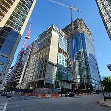 In December 2018, Selig announced that construction on the project would begin in January of the following year. That same month, the project signed on its first tenants, a law firm relocating from Promenade II.[9] By April 2019, condominiums at the property were being sold, with an opening scheduled for Spring 2021.[10] In October, Cushman & Wakefield, acting for Selig, secured $340 million from The Blackstone Group, covering much of the budget, which by this time had risen to approximately $530 million.[11] That same month, it was announced that Google was planning to occupy around 400,000 square feet (37,000 m2) of office space, making them an anchor tenant for the project.[12][13] The project held its official groundbreaking on October 28, 2019.[14] By December 2019, specifications for the project had changed slightly, with plans for 675,000 square feet (62,700 m2) of office space, a 178-room hotel, and 64 condominiums.[15] In January 2020, Brasfield & Gorrie were announced as the project's general contractor, and that same month, the raised plaza, which will serve as a connecting deck between the two buildings, topped out.[16][17]