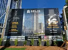 The project, occupying a 3.5-acre (1.4-hectare) lot on West Peachtree Street in Midtown Atlanta, was announced by Selig Enterprises in December 2016.[1] The project, which they announced would begin construction the following Summer, would consist of a 32-story office building featuring 645,000 square feet (59,900 m2) of office space and a residential building housing 80 residences and a 150-room hotel.[2] These two buildings would be connected by a raised plaza, with additional street level retail on the site.[3] The architecture firm Rule Joy Trammell & Rubio would design the project, which had an expected cost of $400 million.[2][3] In June 2017, Selig had applied for permits to demolish three preexisting buildings on the site, including the Dr. Marion Luther Brittain, Sr., House, which was listed on the National Register of Historic Places.[4] Permits were approved later that year,[5] and by January 2018 the buildings were demolished.[6] The next month, it was announced that the hotel for the project would be part of the Autograph Collection by Marriott International.[7][8]