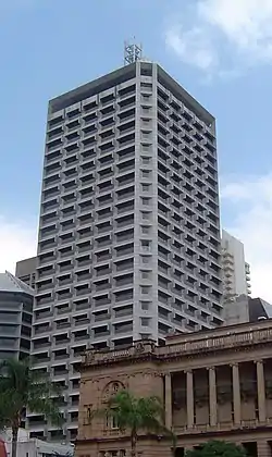 111 George Street is a building on George Street in the Brisbane CBD, Queensland, Australia which was completed in 1993. The building is owned, managed and occupied by the Queensland Government. With its repetitive grill pattern, it is sometimes colloquially referred to as the 'cheese grater'. The site covers 1,299 m2. A sister project known as 33 Charlotte Street was later built on the adjoining site, and has a very similar façade. This smaller building is 75 m high and was completed in September 2004.[1]